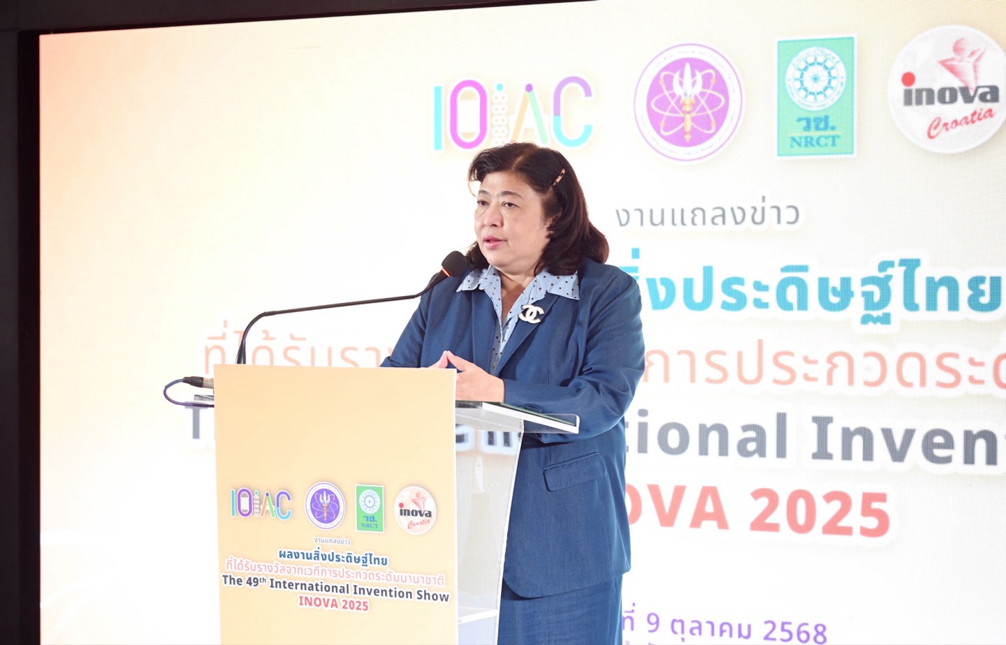 วันที่ 9 ตุลาคม 2568 สำนักงานการวิจัยแห่งชาติ (วช.) กระทรวงการอุดมศึกษา วิทยาศาสตร์ วิจัยและนวัตกรรม จัดงานแถลงข่าวผลงานสิ่งประดิษฐ์ไทยที่ได้รับรางวัลจากเวทีการประกวดระดับนานาชาติ “The 49th International Invention Show” (INOVA 2025) โดย ดร.วิภารัตน์ ดีอ่อง ผู้อำนวยการสำนักงานการวิจัยแห่งชาติ ให้เกียรติเป็นประธานในพิธีเปิด ณ ศูนย์ข้อมูลสารสนเทศกลางด้านวิทยาศาสตร์ วิจัยและนวัตกรรมของประเทศ สำนักงานการวิจัยแห่งชาติ